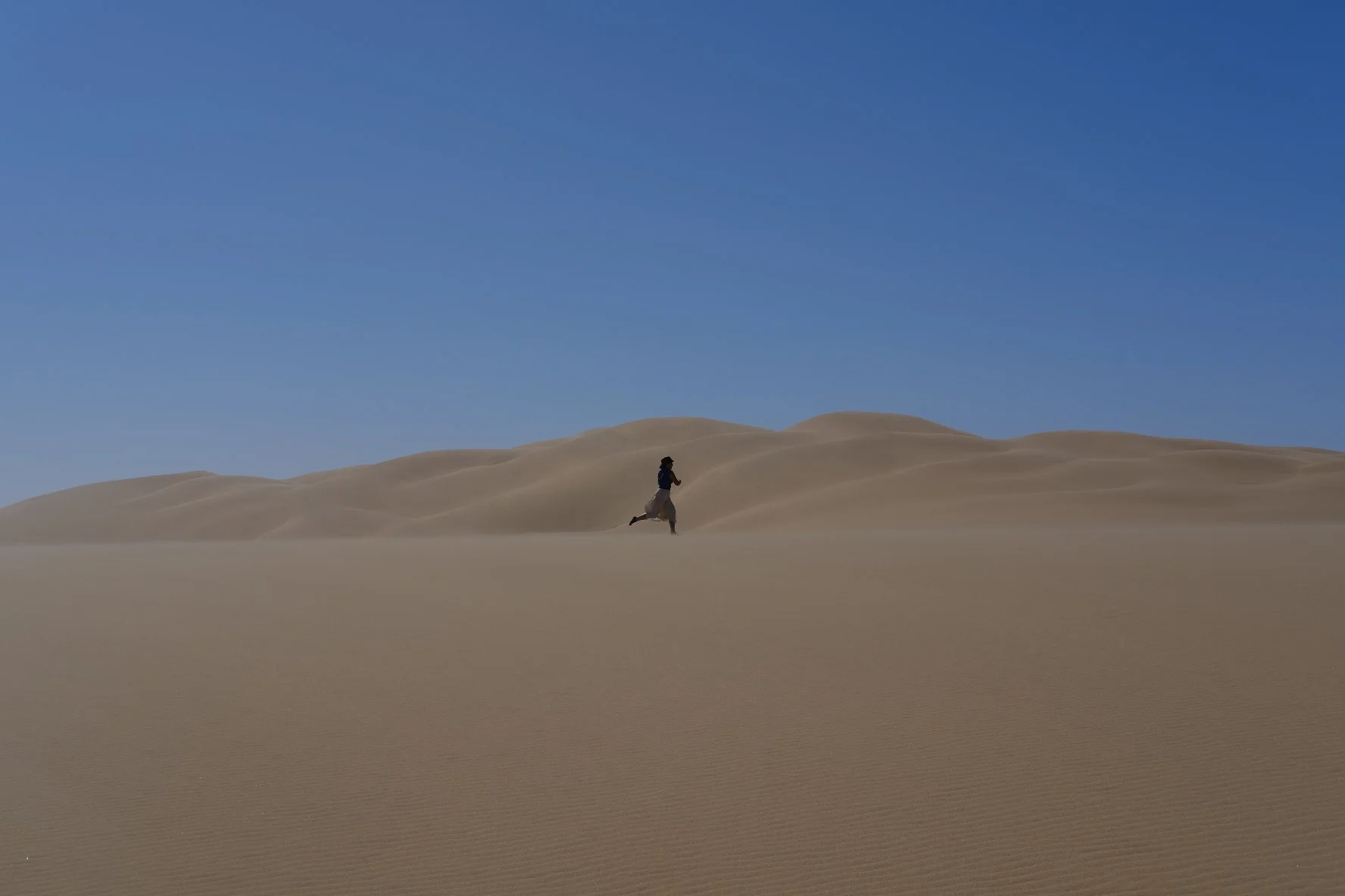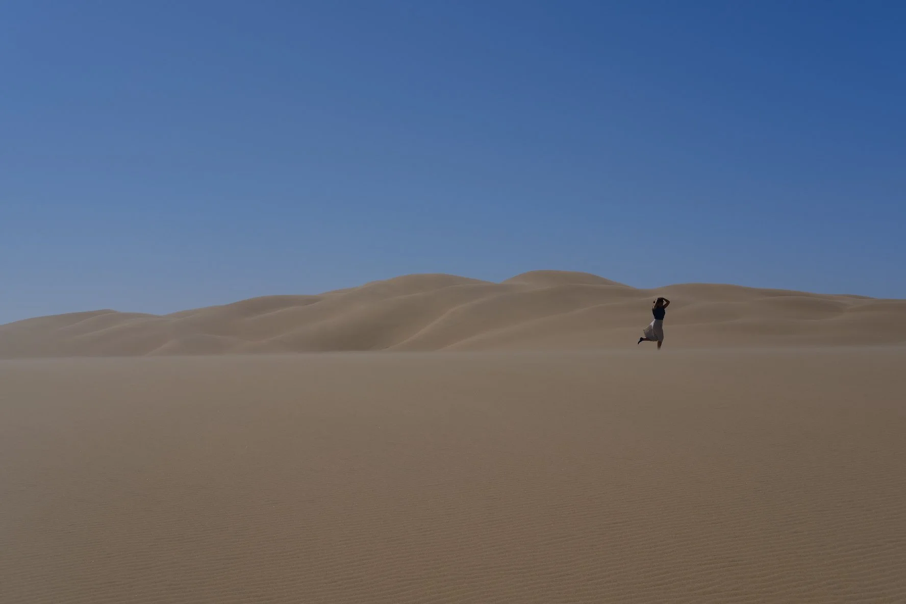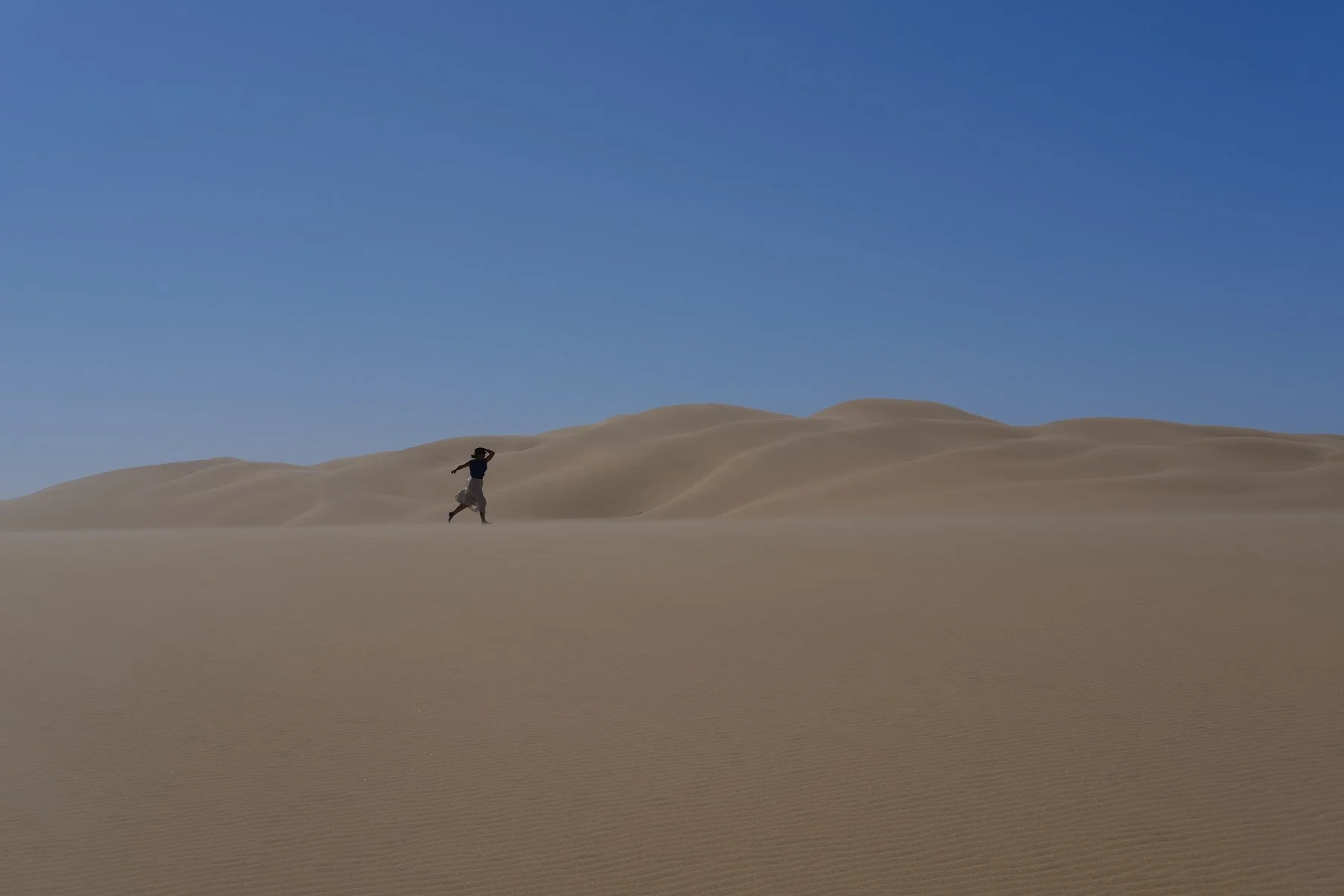 We drove through the dunes with no one in sight so we got off the jeep and started trekking to the huge dunes but as we trek up to the dunes, we started seeing pieces of animal bones… We were getting nervous but we kept hiking up. It was a little scary because we saw a wild dog during sunrise. The hike got harder and harder and I tried not to look back and down because it was so steep. It’s a strange sight in dessert that the hill can be so steep but doesn’t feel that dangerous. As we got to the top, we peeked through and were amazed by the endless rolling dunes that moves like ocean while the ocean was just right there. The wind was so strong that we felt like we were going to be blown away.